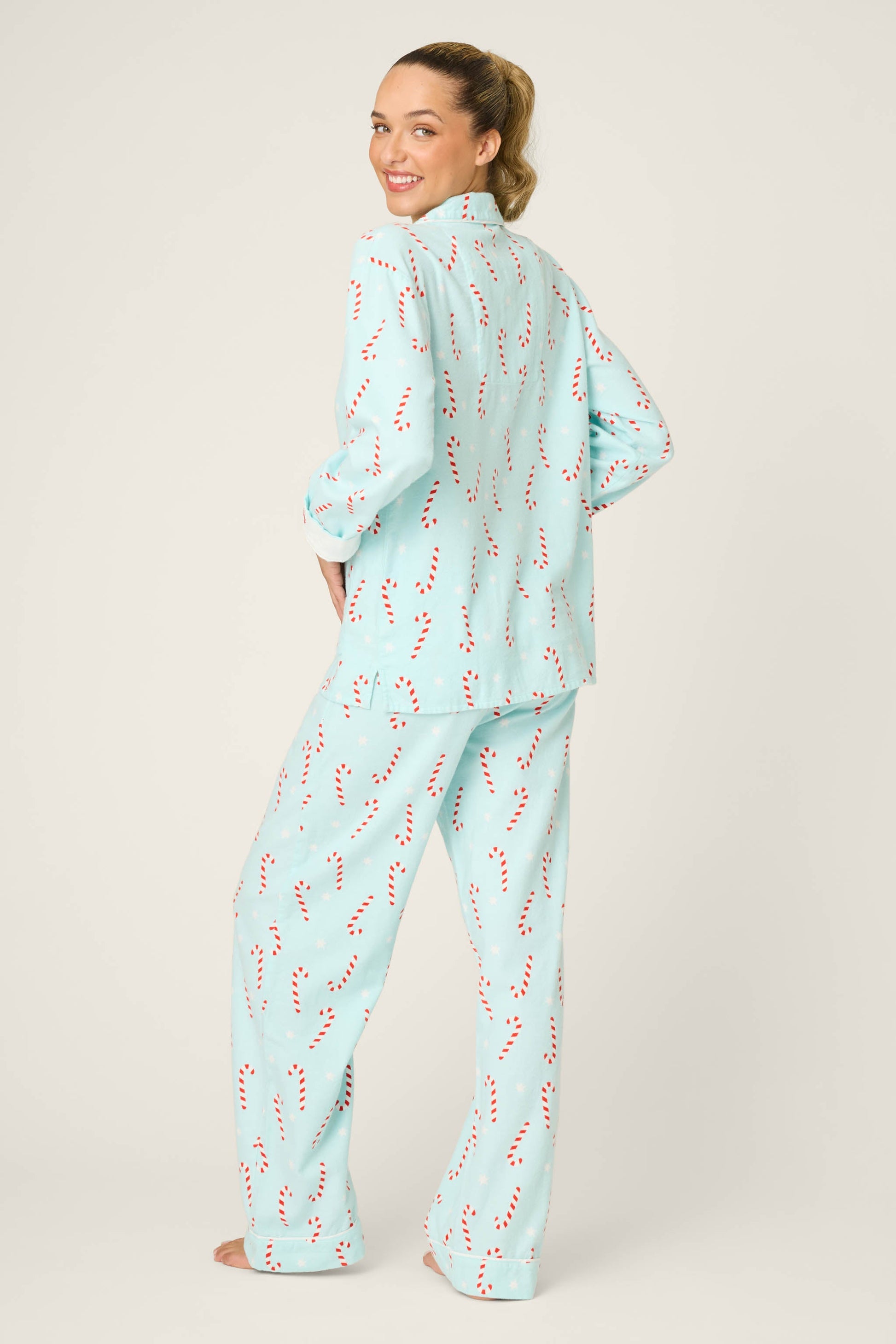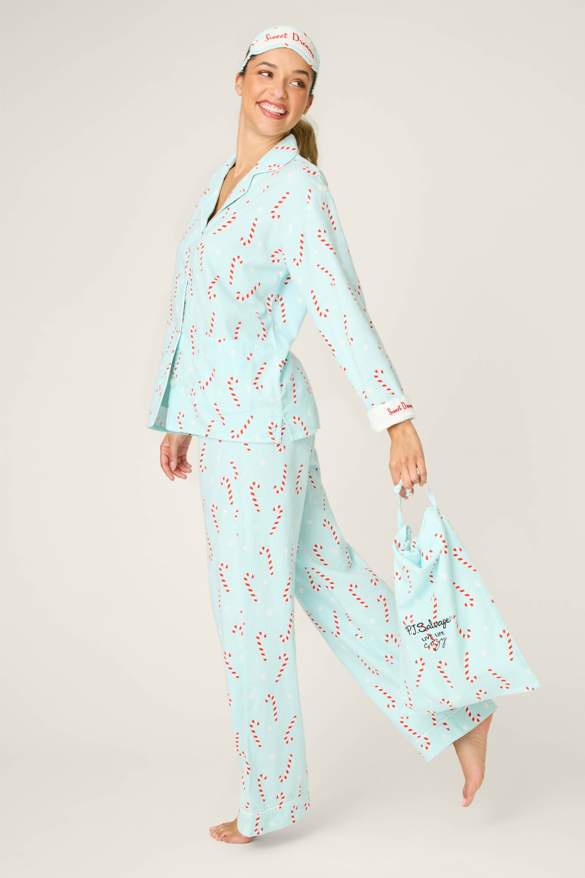 Bring the sweet to the season in this light aqua cotton flannel pajama set, sprinkled with candy canes and stars. This three-piece design includes a button-up top, straight-leg drawstring pants, and a matching eye mask—made for festive mornings, holiday movie marathons, and cozy nights in.