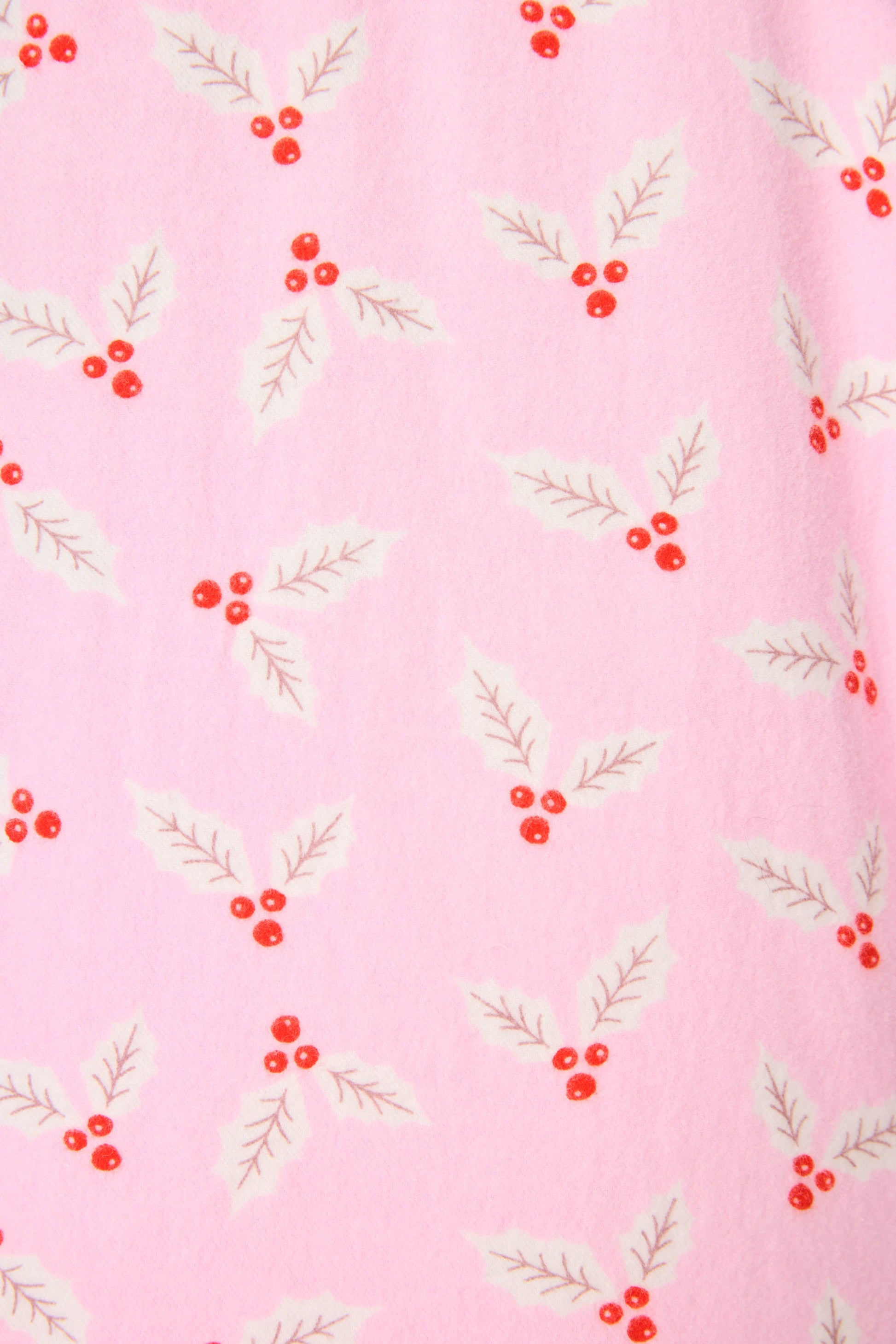 Holly jolly, indeed. This pink cotton flannel pajama set is sprinkled with mistletoe berries and sprigs. This three-piece design includes a button-up top, straight-leg drawstring pants, and a matching eye mask—perfect for gift wrapping, present unwrapping, and holiday lounging in style.