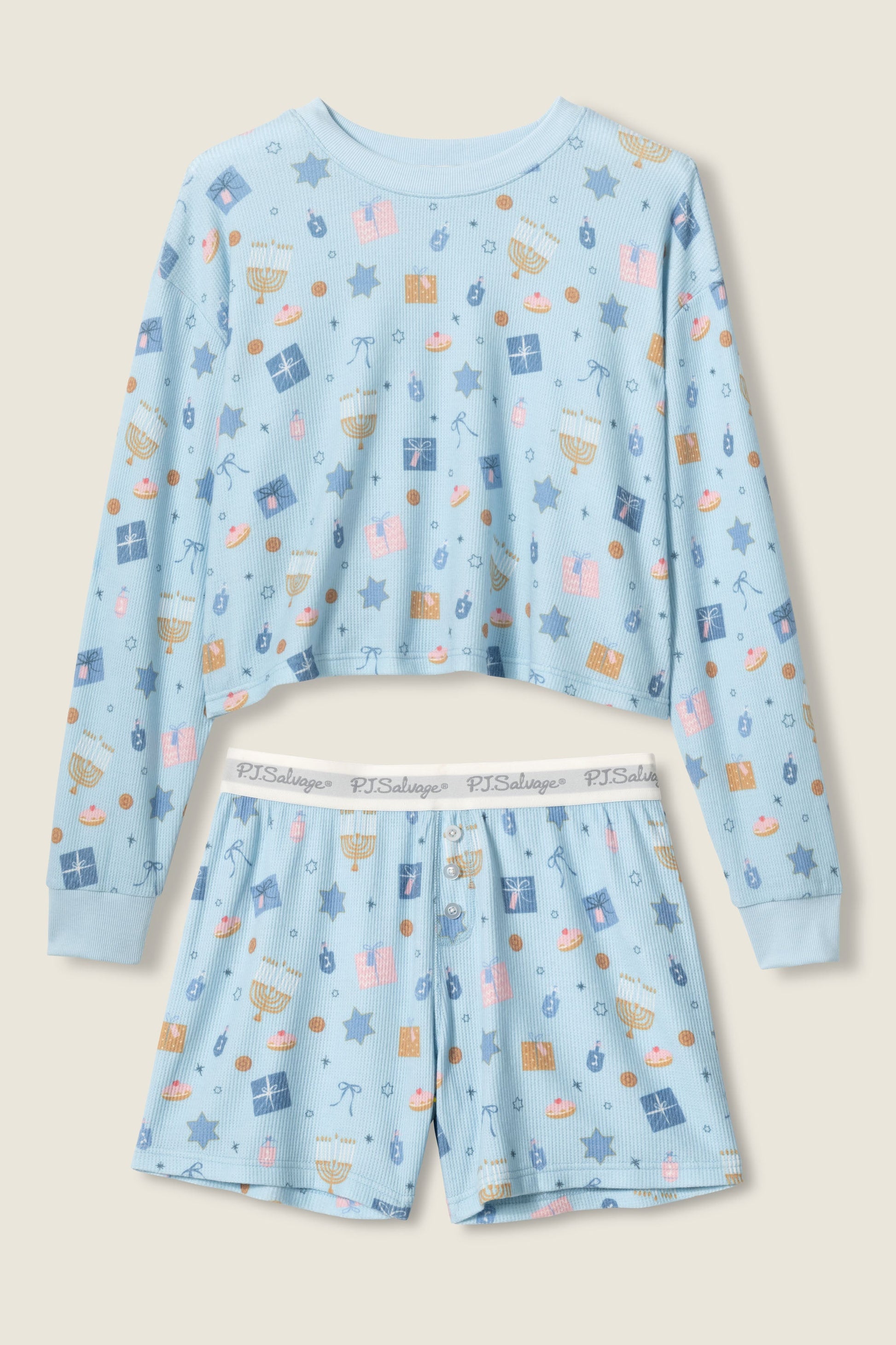 Sleep just hits different in a cozy thermal set that’s cute, comfy, and full of personality. This soft waffle-knit duo pairs a long-sleeve top with boxer-style shorts, both crafted from our baby peachy fabric with the perfect brushed feel. The light blue base is sprinkled with menorahs, dreidels, and stars—a festive nod to Hanukkah nights, cozy seasonal lounging, and thoughtful gifting.