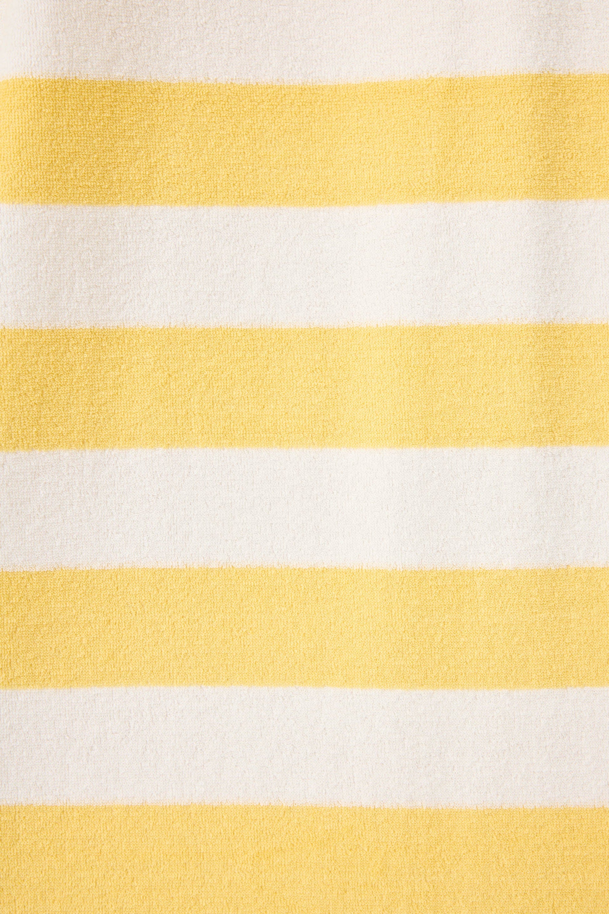 Easy, laid-back, and made for sun-soaked days—this striped terry dress is your go-to for effortless poolside lounging. Crafted from our soft vintage loop terry in bold yellow and ivory stripes, it channels retro resort glamour with a fresh coastal feel. A hood, V-neck, and front kangaroo pocket keep things casual, while the ¾-length sleeves and fringed trim add a touch of playful texture.