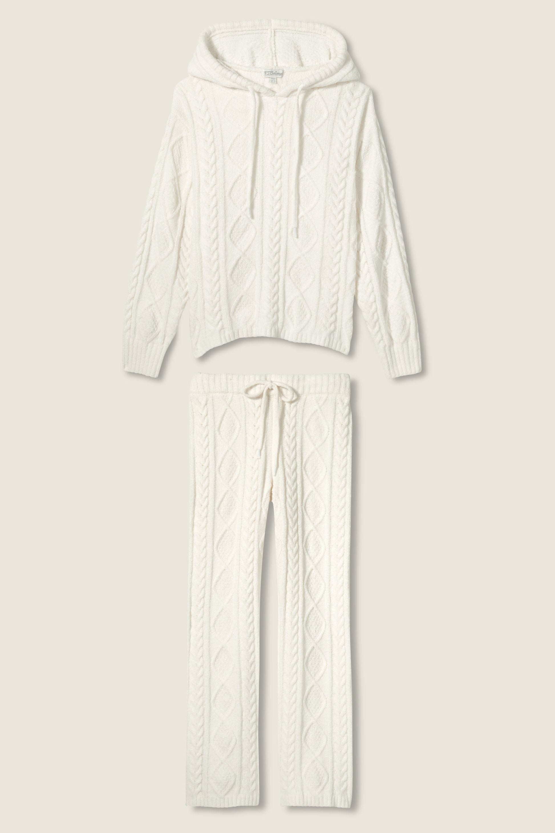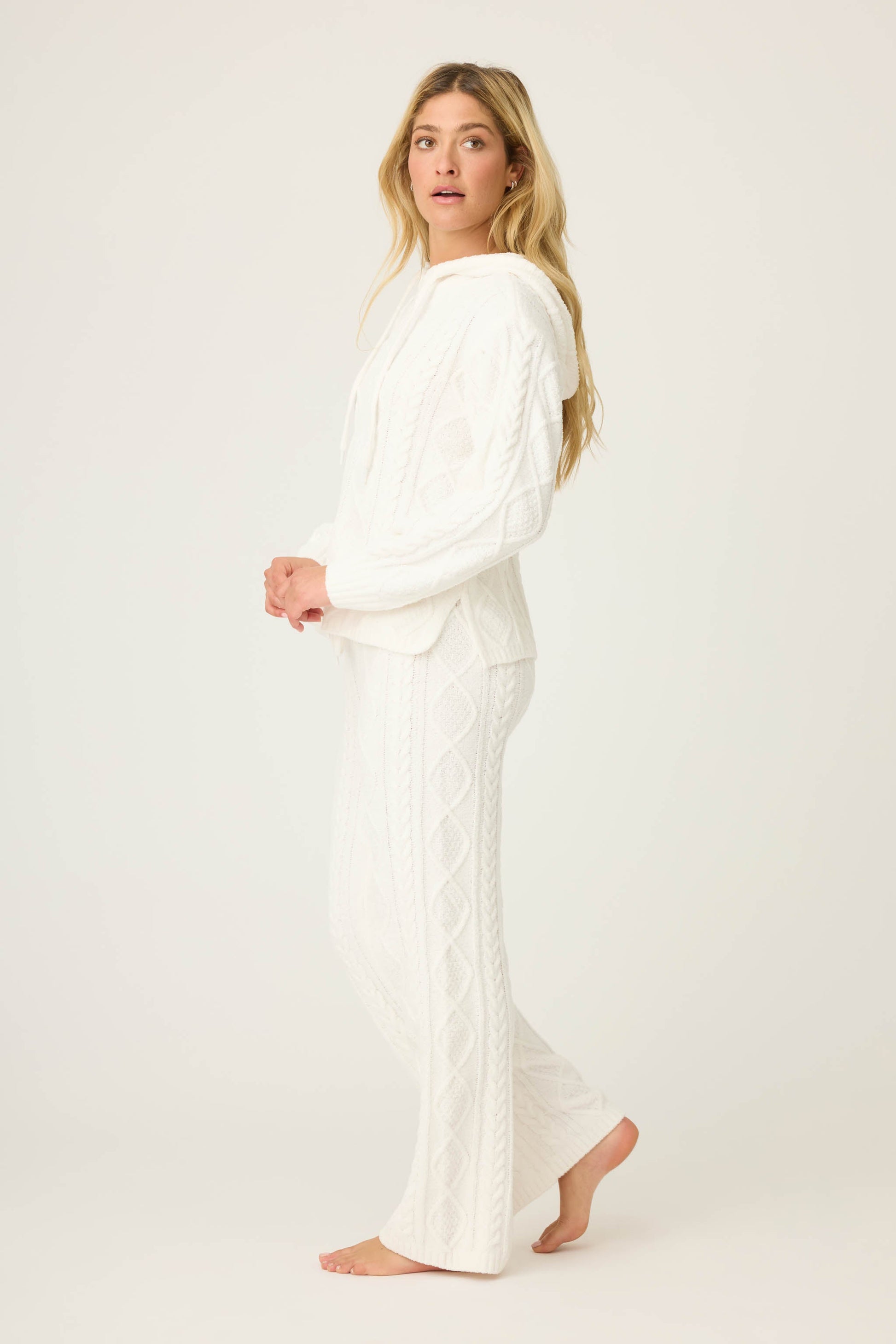 The ultimate in stay-home softness, this chenille cable knit pajama set features a roomy hoodie with matching drawstring pants. The creamy off-white hue feels fresh and inviting for crisp fall days—perfect for lazy Sunday mornings with a good book or winding down with a favorite show.