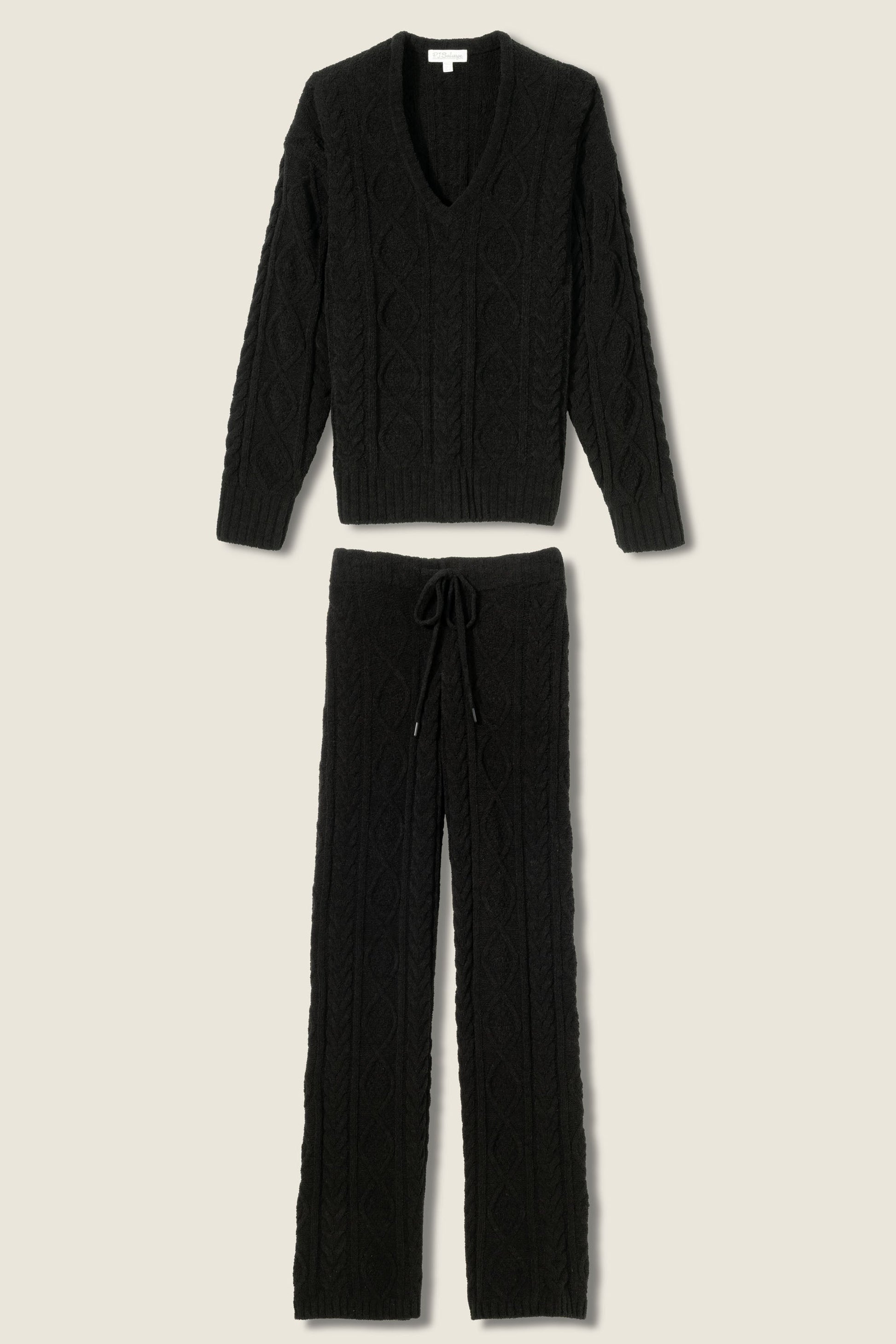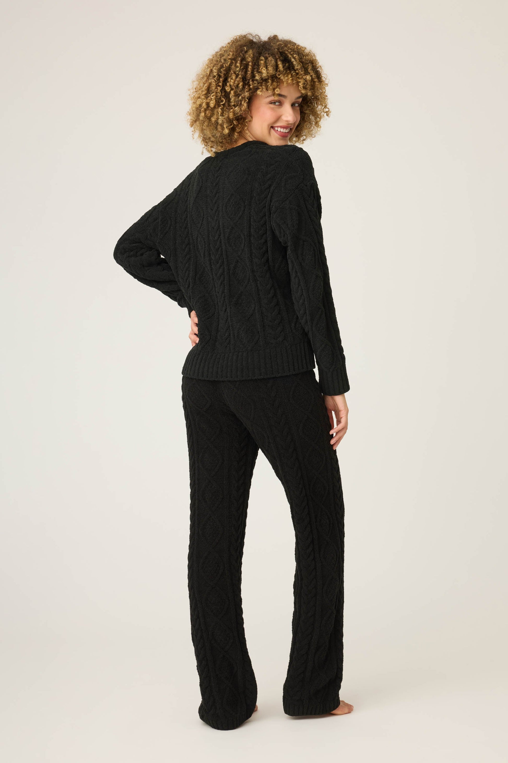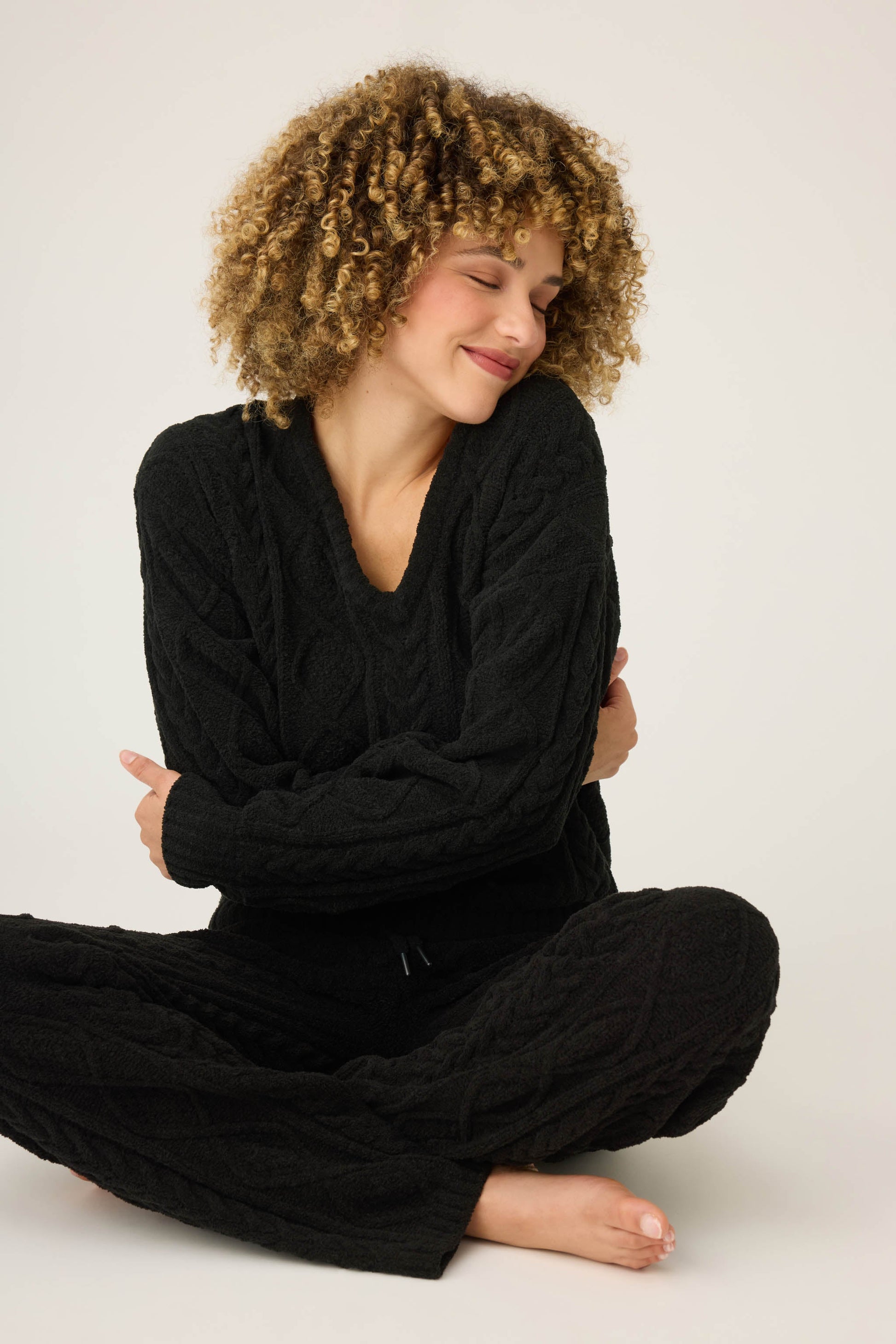 The ultimate in stay-home softness, this chenille cable knit pajama set pairs a relaxed V-neck pullover with matching drawstring pants. The inky black hue and plush texture make it just as inviting for a night in as for a slow weekend morning.