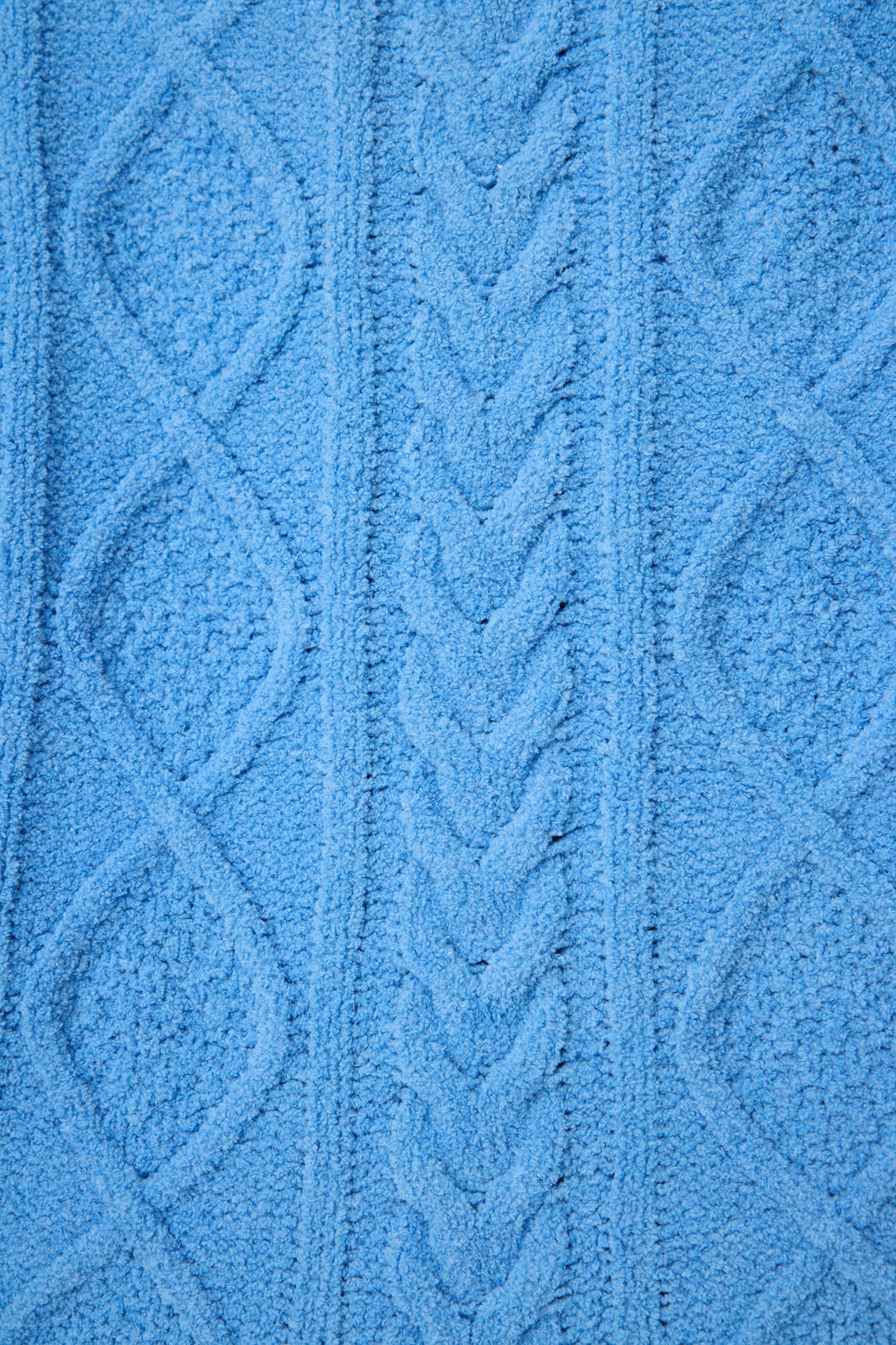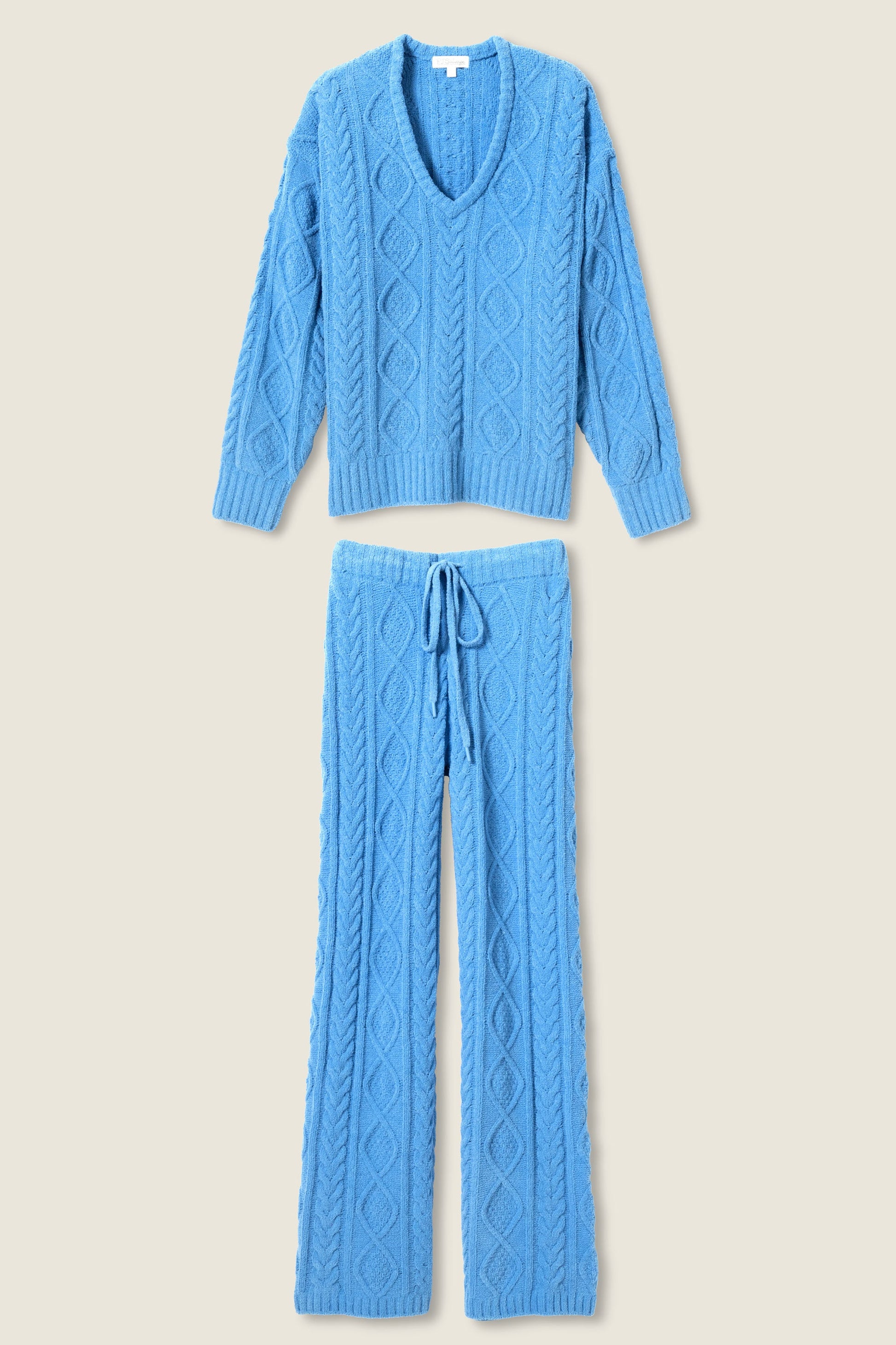 The ultimate in stay-home softness, this chenille cable knit pajama set pairs a relaxed V-neck pullover with matching drawstring pants. The bright blue hue adds a cheerful pop to cozy days and nights.