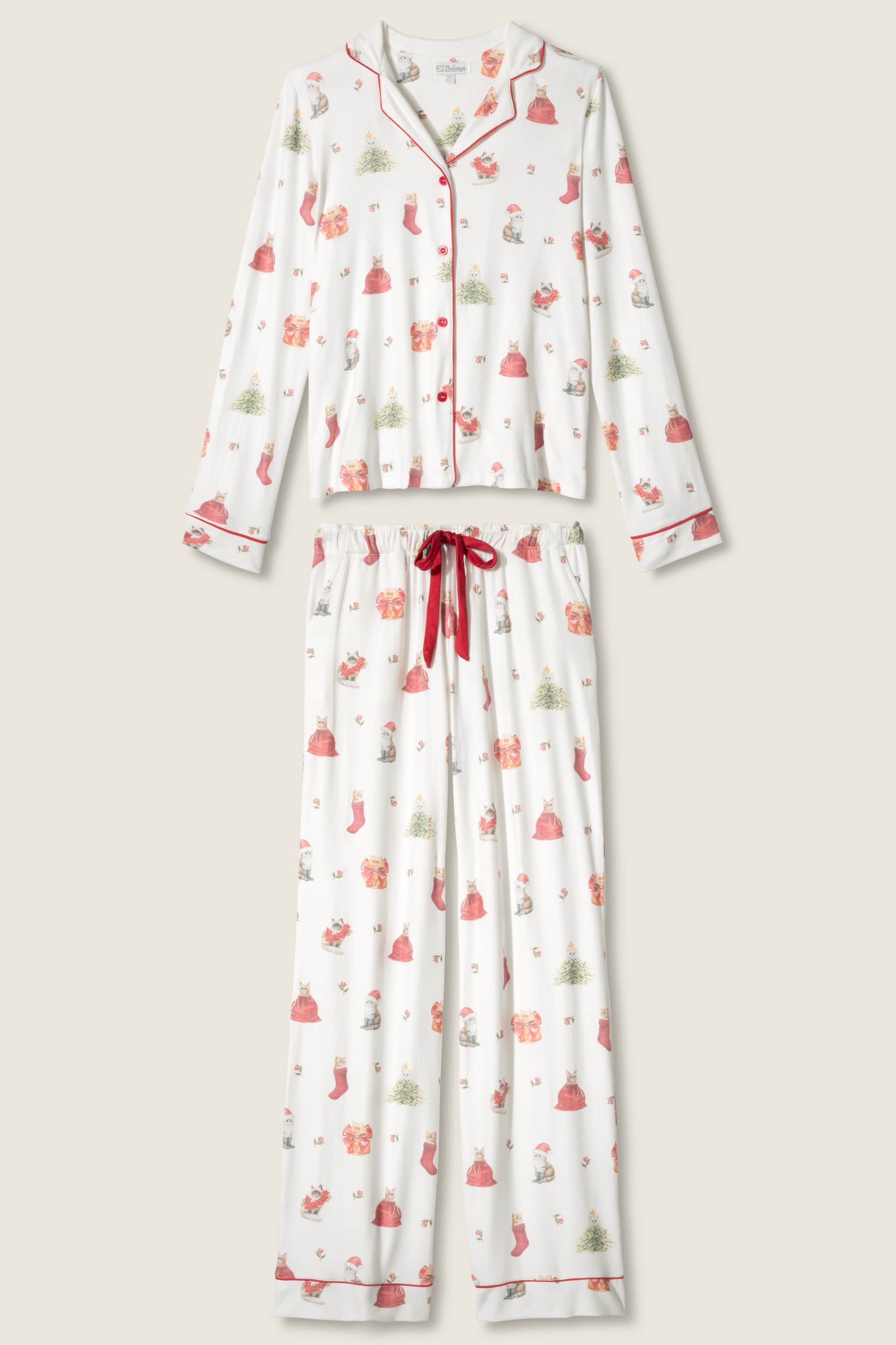 Feel-ine festive this holiday season in butter-soft jersey pajamas scattered with merry little cats—popping out of stockings, hiding in gift bags, or doubling as Christmas trees. The button-down top gets a cheery finish with red piping and buttons, while the relaxed pants tie at the waist with a bright contrast drawstring. Made for curling up with cocoa, holiday movie marathons, and catnaps that last all afternoon.