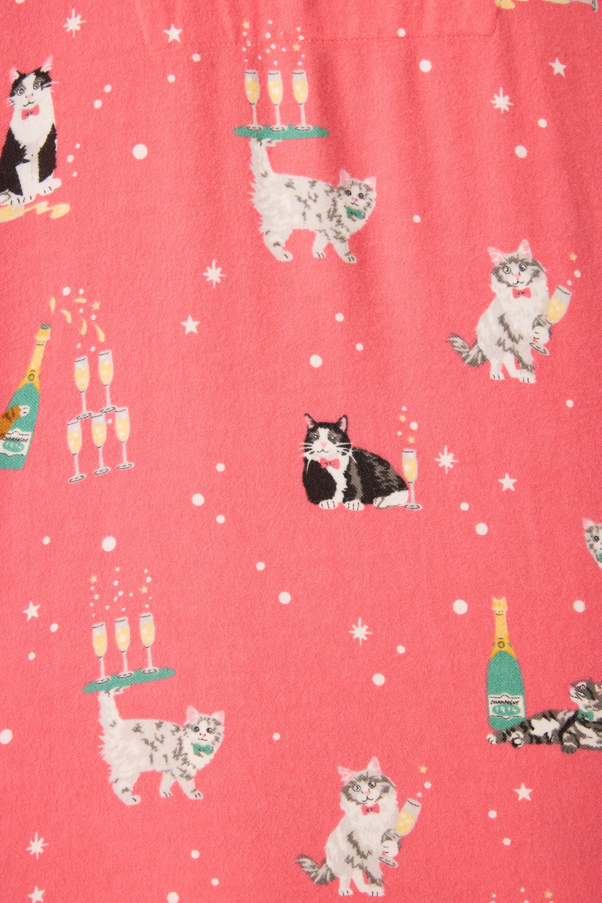 Feel-ine festive, this three-piece flannel set is made from soft cotton in a classic twill weave, complete with a button-front top, relaxed drawstring pants, and a matching headband. The coral backdrop is covered in cats sipping champagne and clinking flutes, finished with contrast piping and a cuff that cheekily reads “Let’s Get Fizzical”—purr-fect for holiday lounging, bubbly nightcaps, and curling up for a catnap.