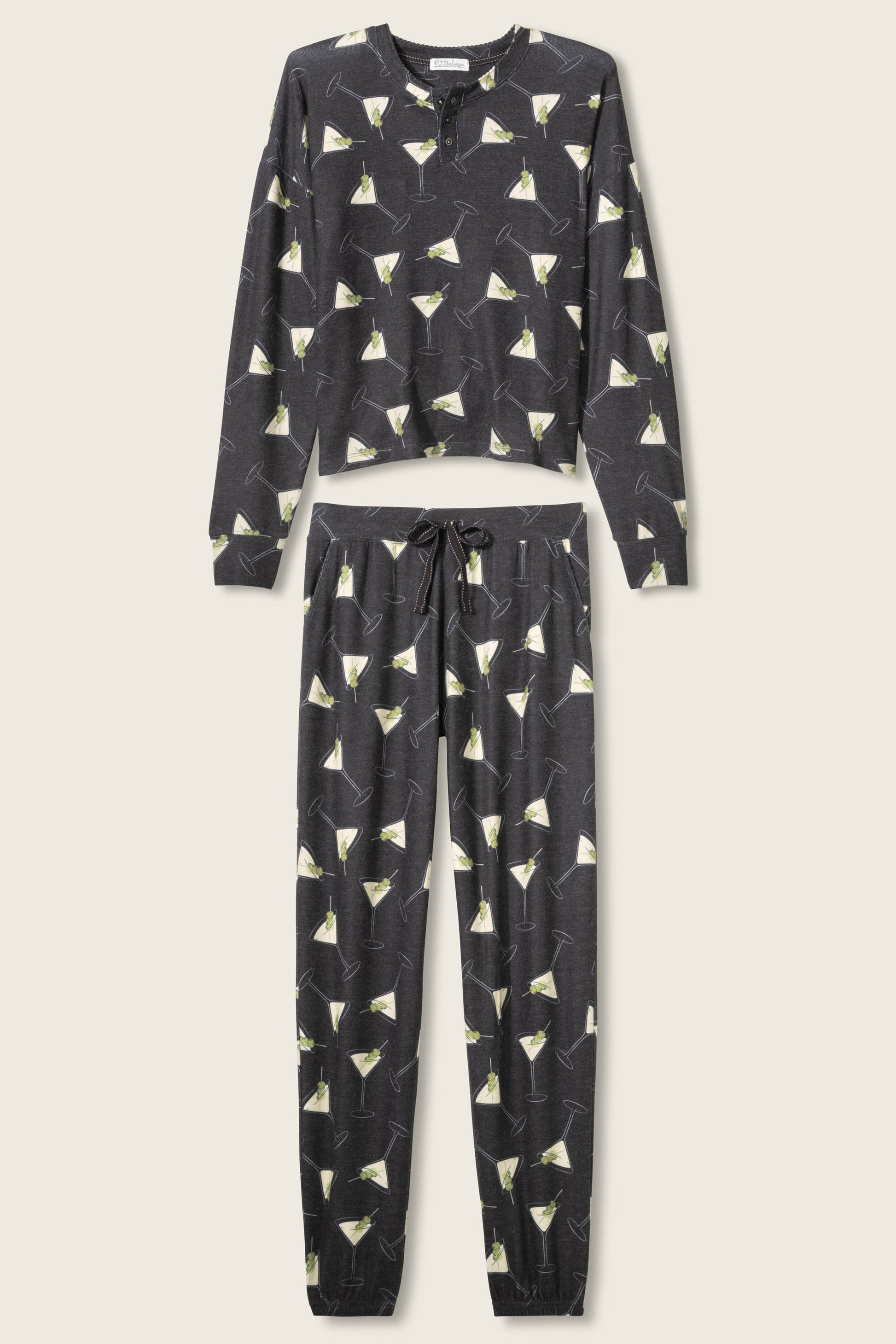 Toast the season in comfort. This two-piece pajama set is crafted from peachy-soft knit with a festive martini glass print, complete with green olives. The relaxed long sleeve top and drawstring jogger pants make it a merry choice for nights in.
