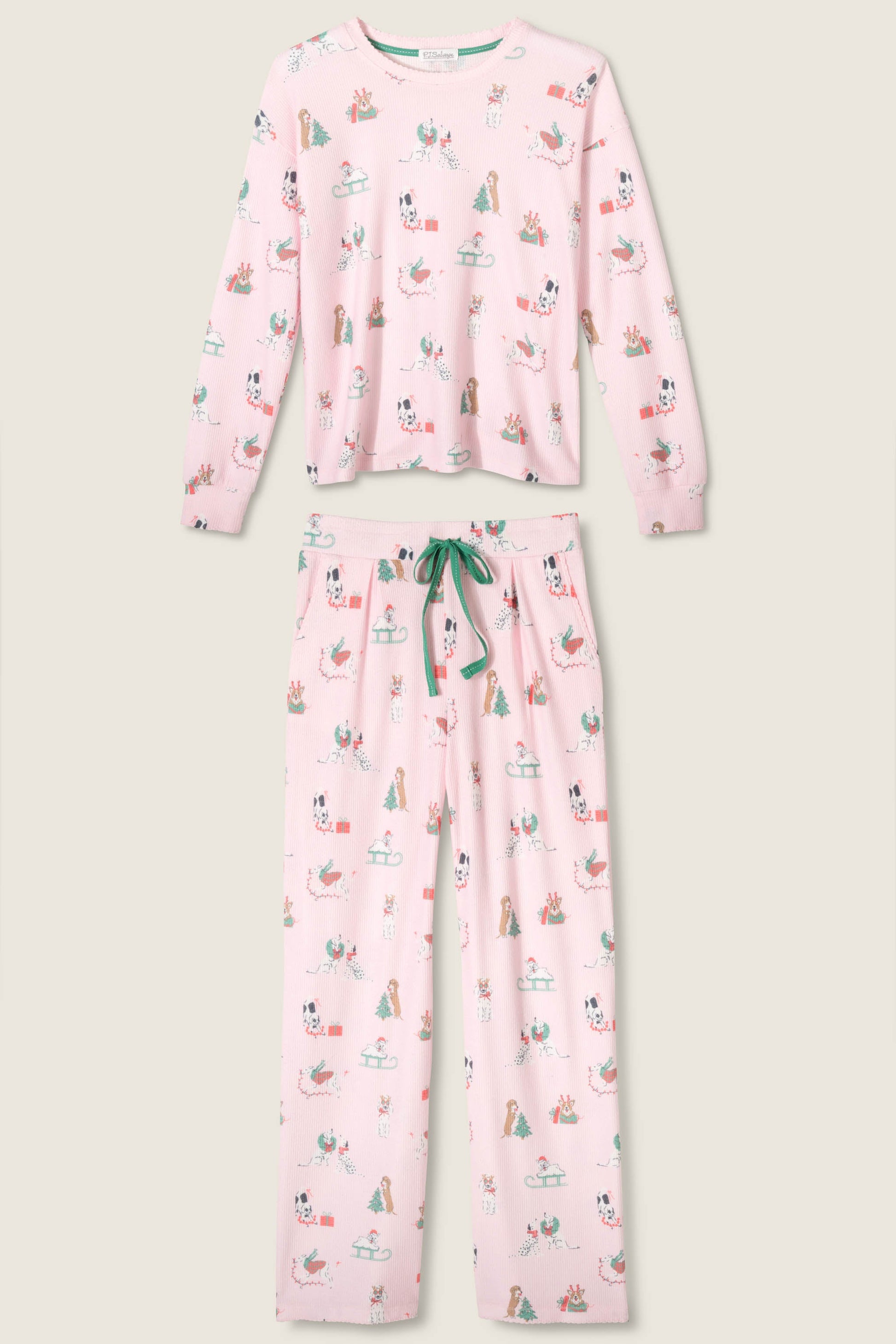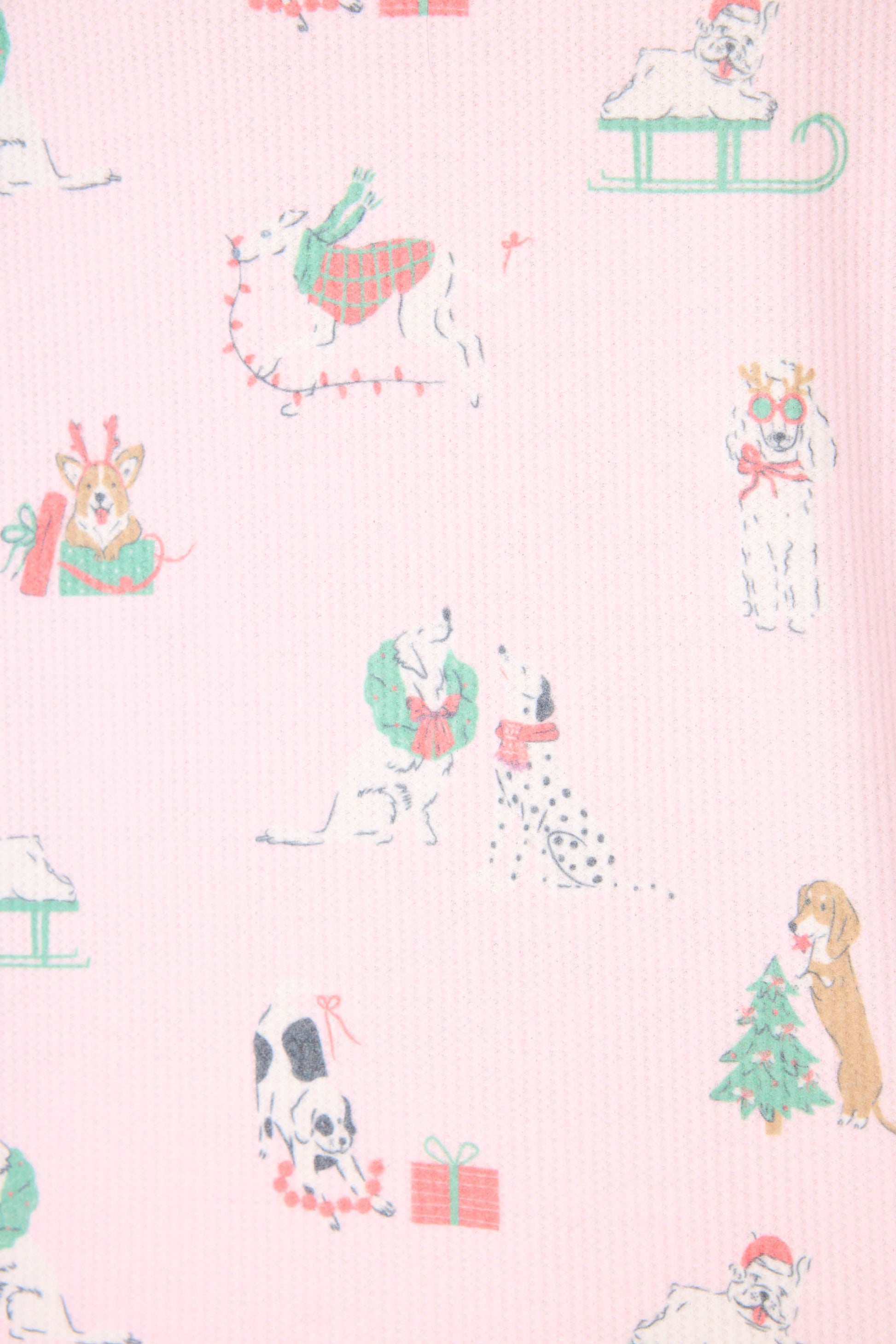 Deck the dogs with boughs of holly—this pajama set is holiday spirit wrapped in baby peachy waffle. Printed with pups in wreaths, lights, and festive gear, the long-sleeve crew top and drawstring pants bring cozy comfort with a playful twist that’s made for tree-trimming nights and Christmas-morning lounging.