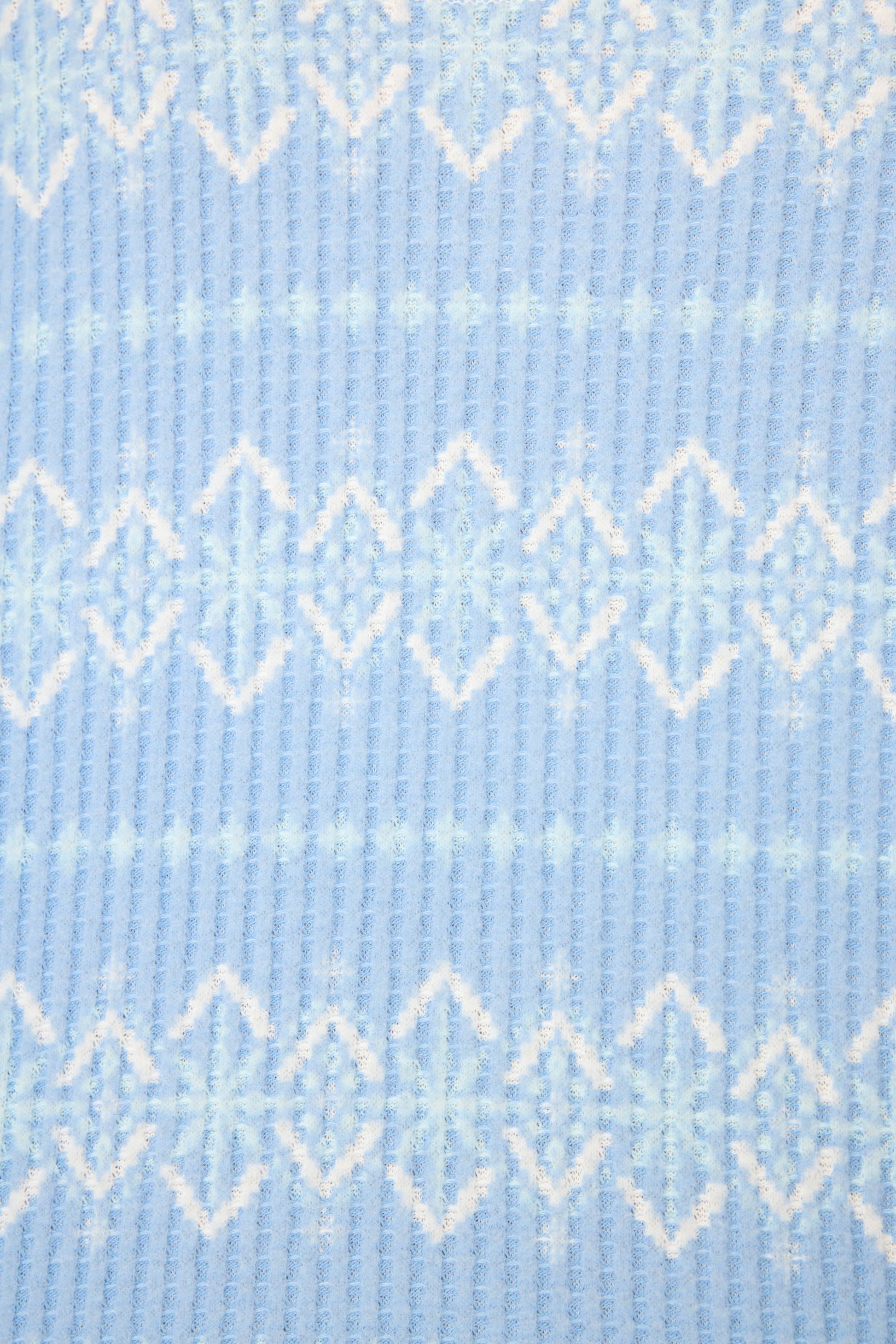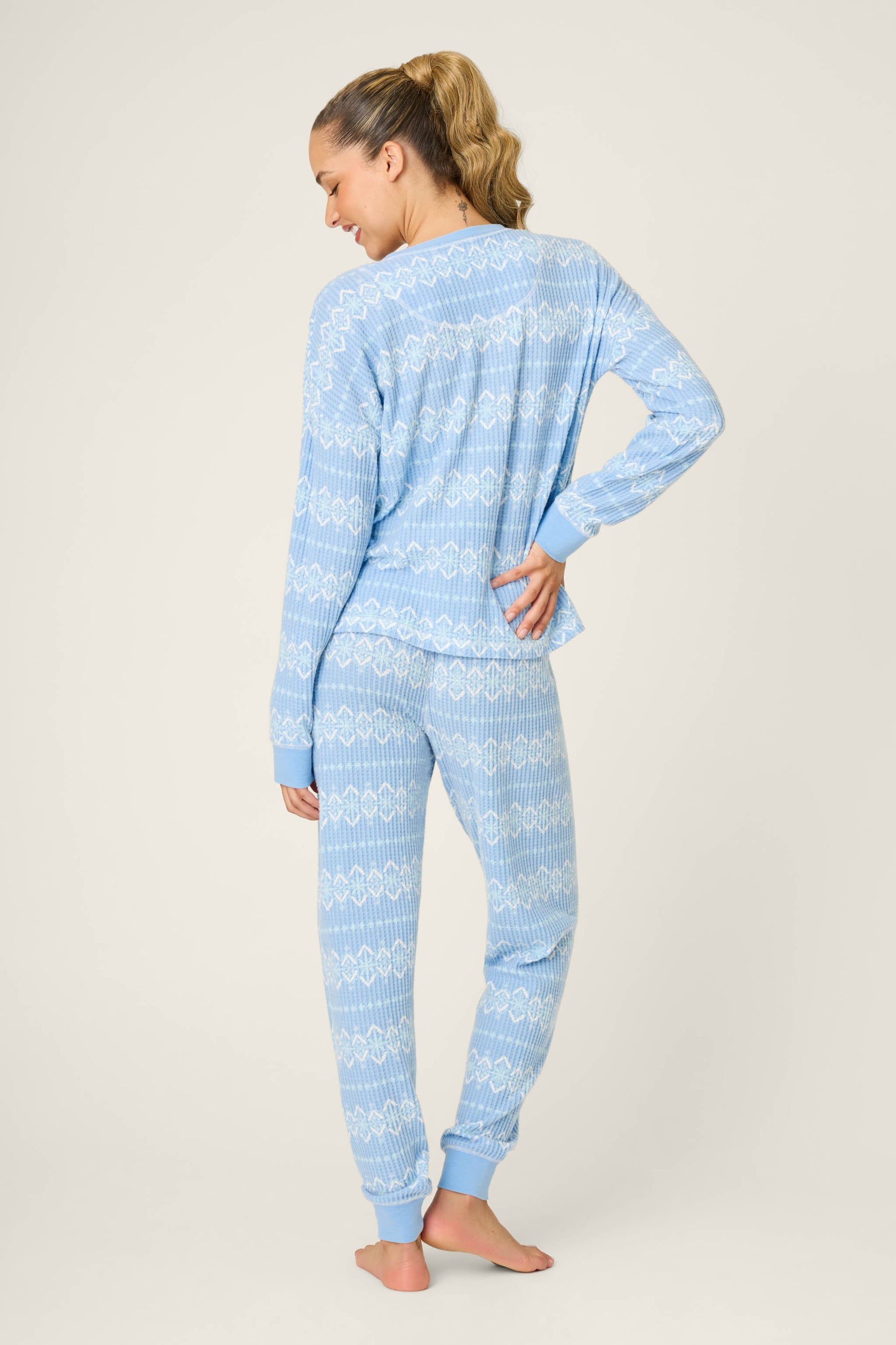 Bring the après-ski spirit home in this brushed thermal pajama set patterned in wintry blue Fair Isle stripes. Finished with a henley top trimmed in blue and jogger pants tied with a white ribbon, it’s made for cozy nights after a day on the slopes—or just channeling alpine charm from the couch.