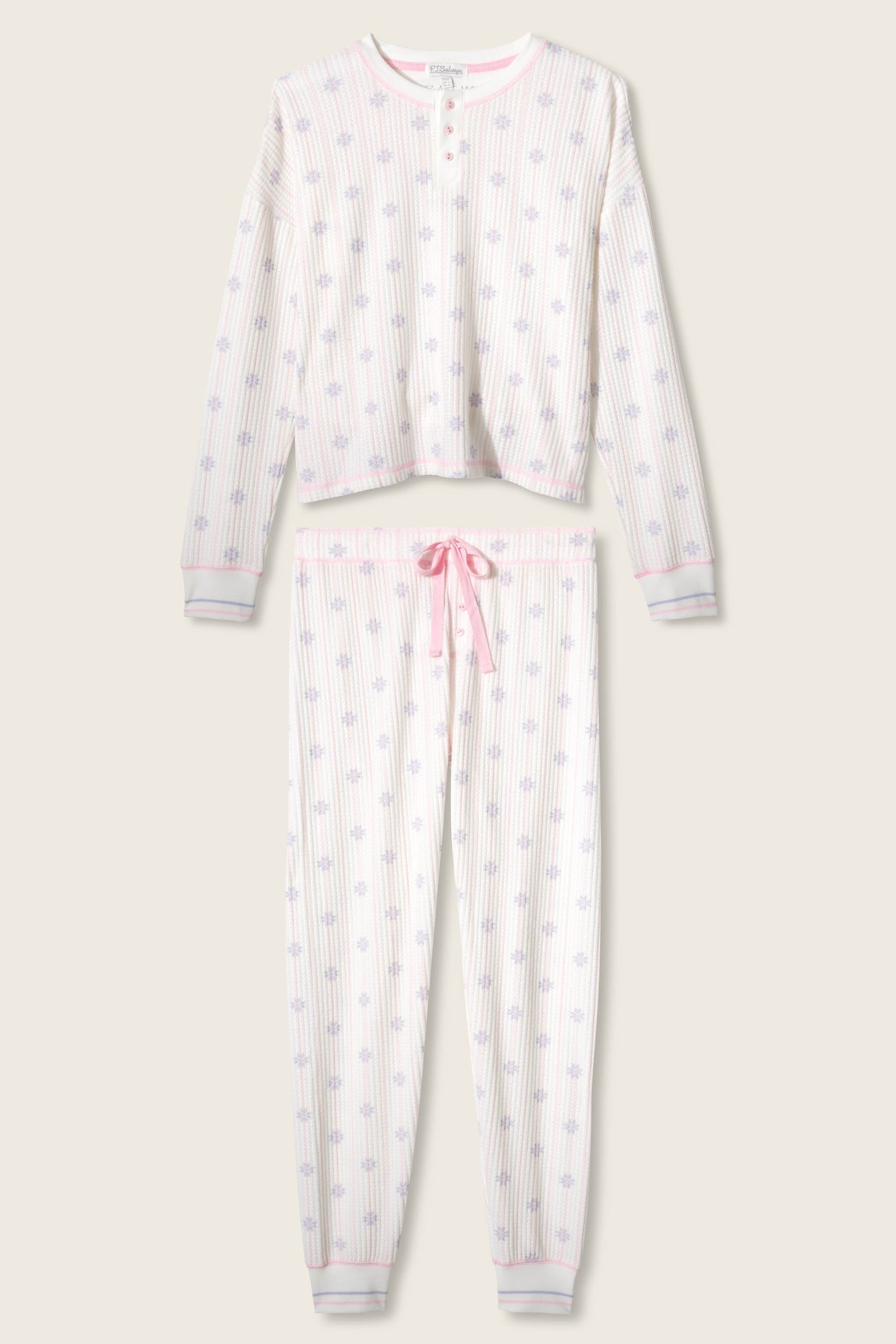 The ultimate après ski uniform—this snowflake-print pajama set is crafted from soft brushed thermal with the perfect touch of stretch. The long-sleeve henley top and jogger pants feature delicate blue snowflakes drifting across an ivory backdrop, finished with striped cuffs and a playful pink tie waist. Whether you’re curled up by the fire with a hot cocoa, sipping your favorite cocktail under a blanket, or winding down with a movie after a day on the slopes, this set makes every snow day feel extra cozy.