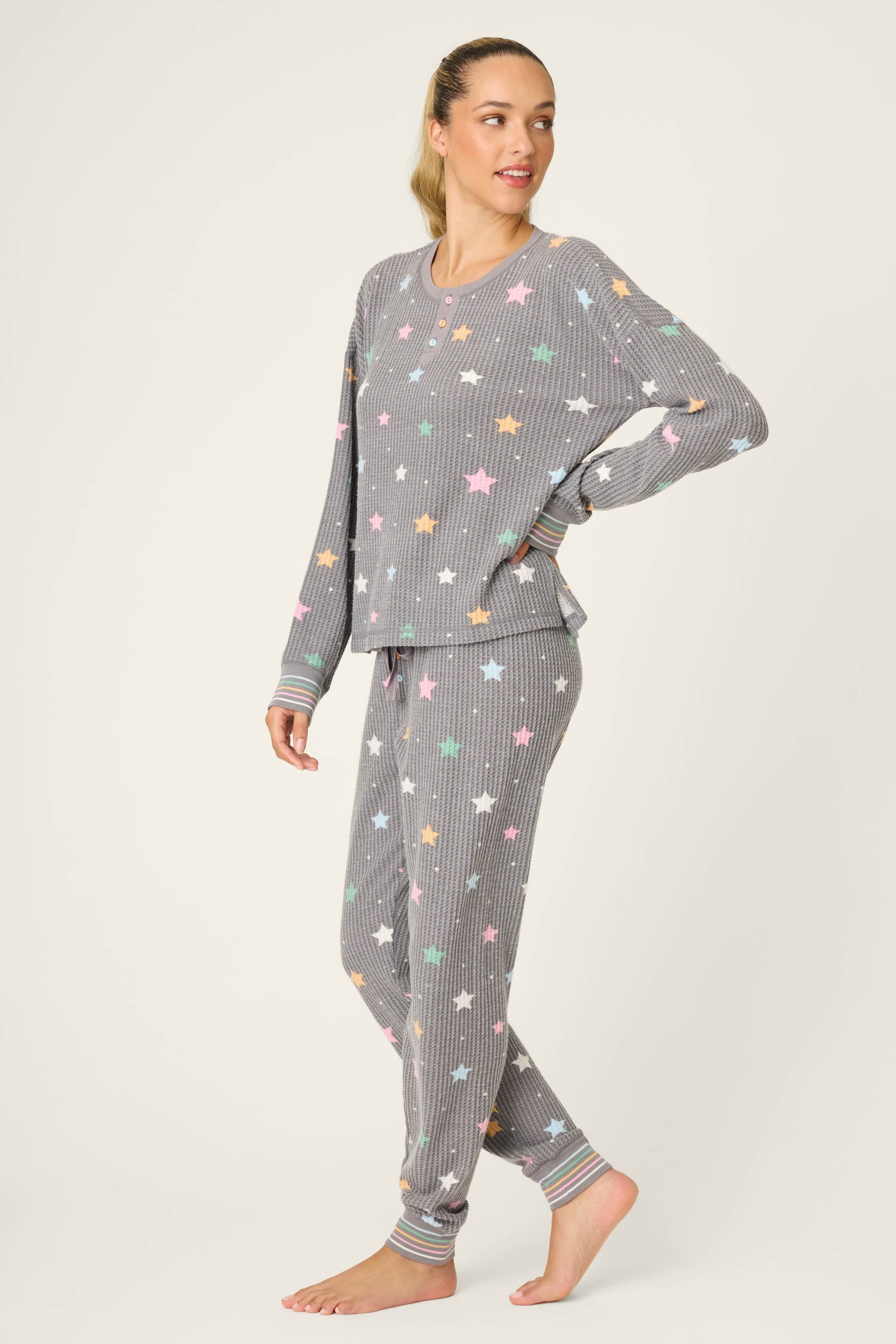 The ultimate après ski uniform—this star-print pajama set is crafted from soft brushed thermal with just the right amount of stretch. The long-sleeve henley top and jogger pants are sprinkled with candy-colored stars on a charcoal backdrop, finished with striped cuffs for a playful touch. Whether you’re curling up by the fire with a hot beverage, sipping a cocktail under a blanket, or watching movies after a day on the slopes, this set is made for starry nights in.