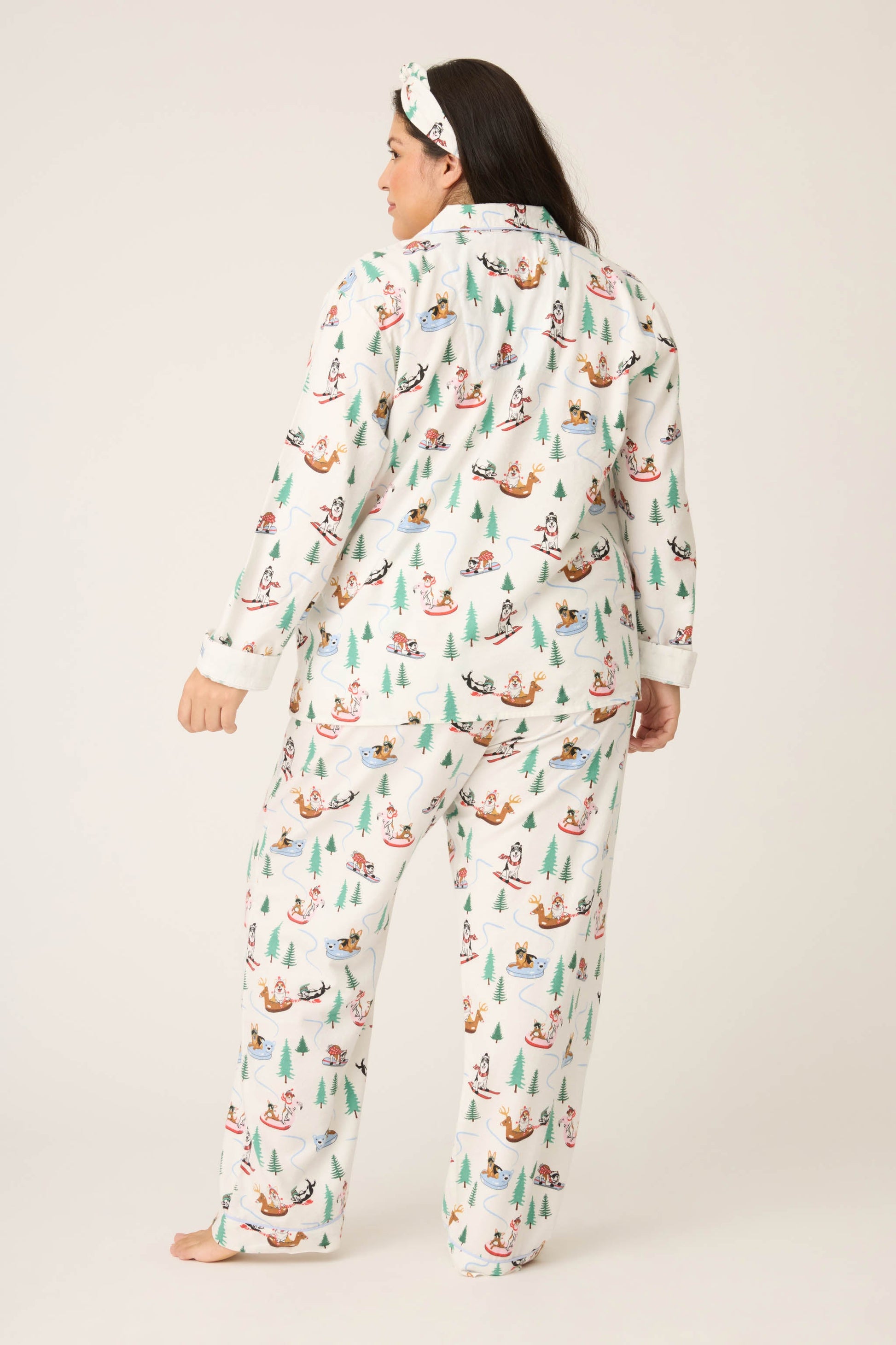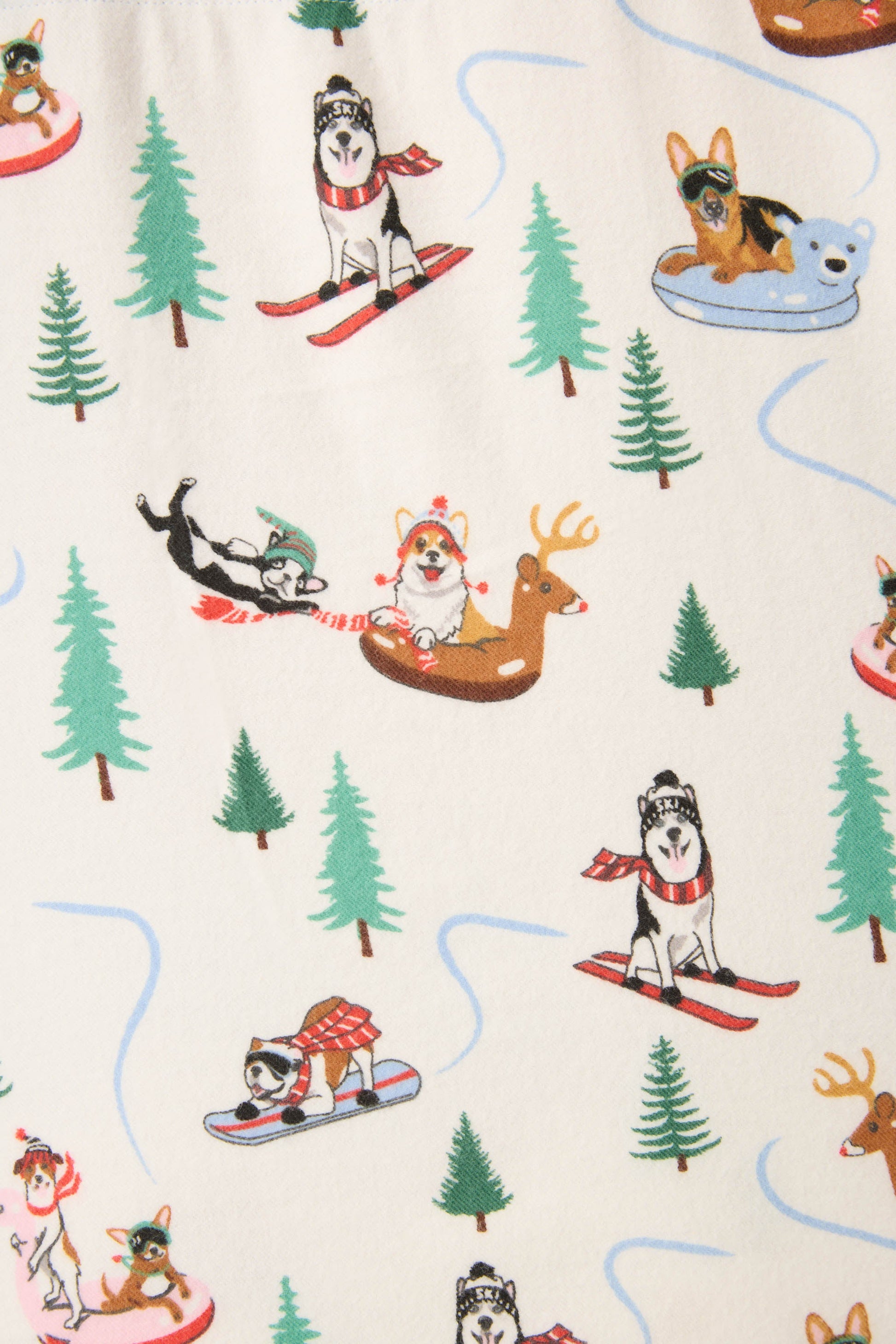Paw-sitively cozy and snow much fun, this three-piece flannel set is made from soft cotton in a classic twill weave, complete with a button-front top, relaxed drawstring pants, and a matching headband. The winter-white backdrop is scattered with playful pups skiing, sledding, and tubing through the trees, finished with contrast piping and a cheeky cuff that reads “Sleigh All Day.” Perfect for snow days, couch days, and snoozing after all the fun.