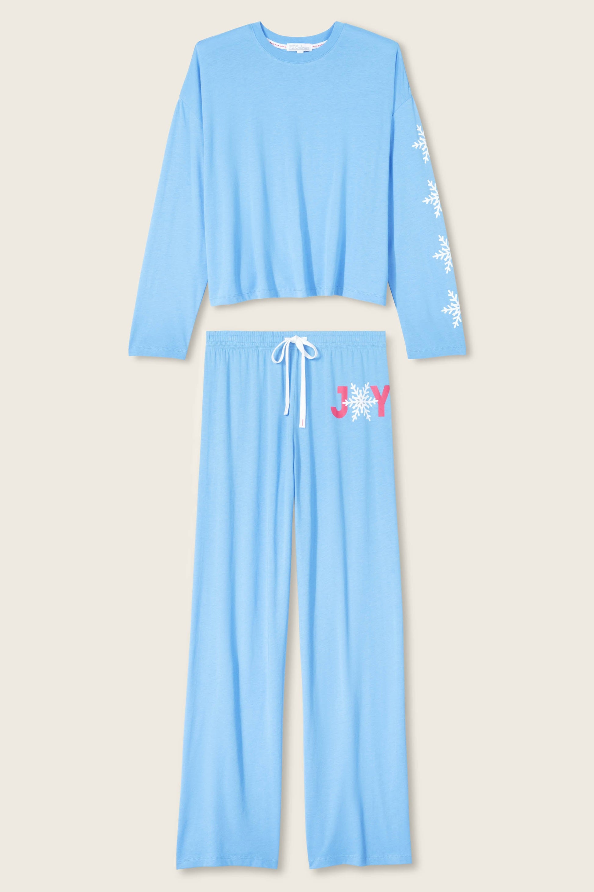 Celebrate cozy season in this frosty blue pajama set, made from soft jersey with a cropped long sleeve top and relaxed drawstring pants. Snowflake graphics and a bold “Joy” motif keep the spirit bright for winter lounging, snow days, and beyond.