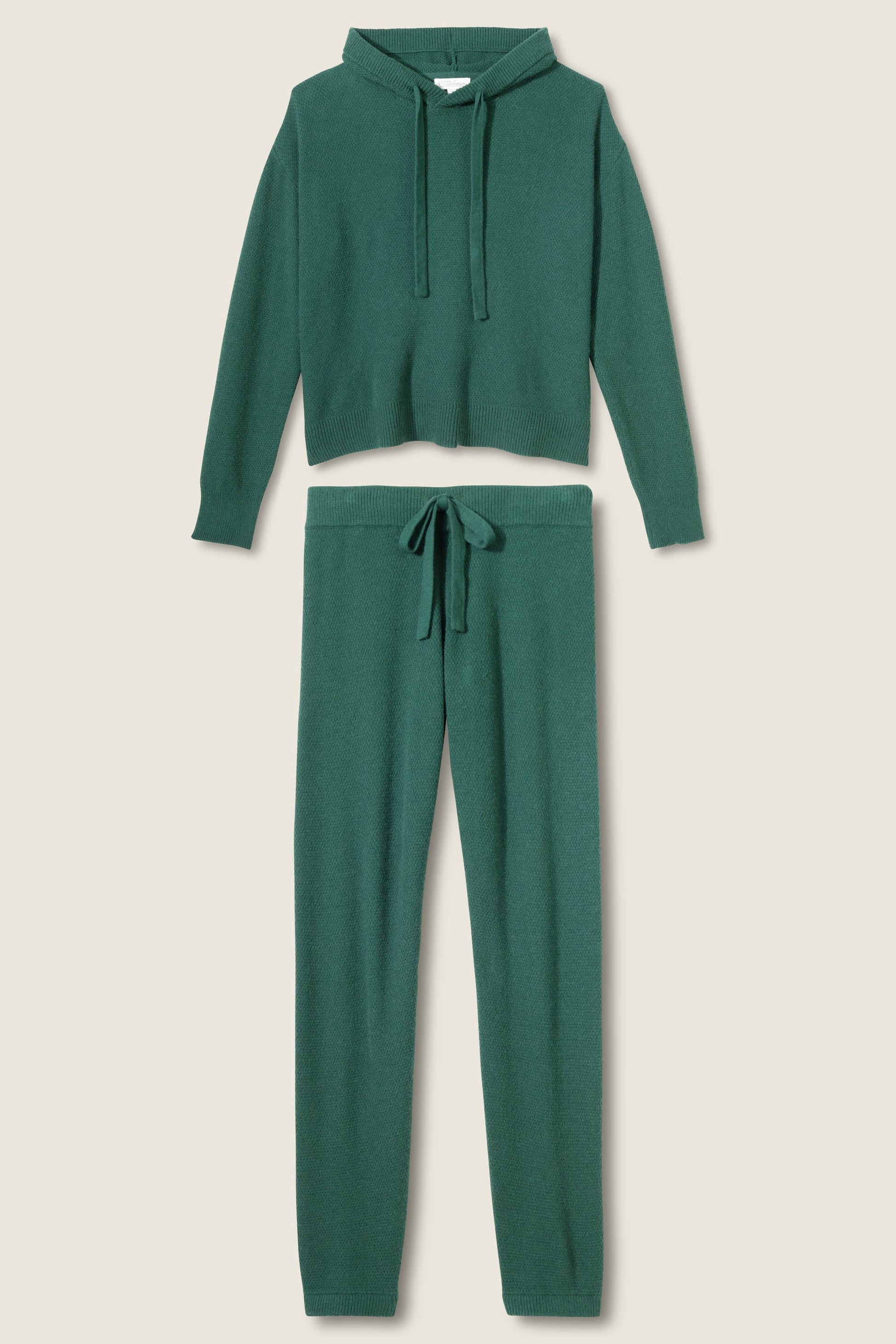 Meet your new lounging favorite. This sweater knit pajama set is soft yet structured, featuring a drawstring hoodie with a relaxed fit and matching jogger pants with banded cuffs. In deep forest green, it’s a cozy essential that doubles as a festive layer for the holiday season.