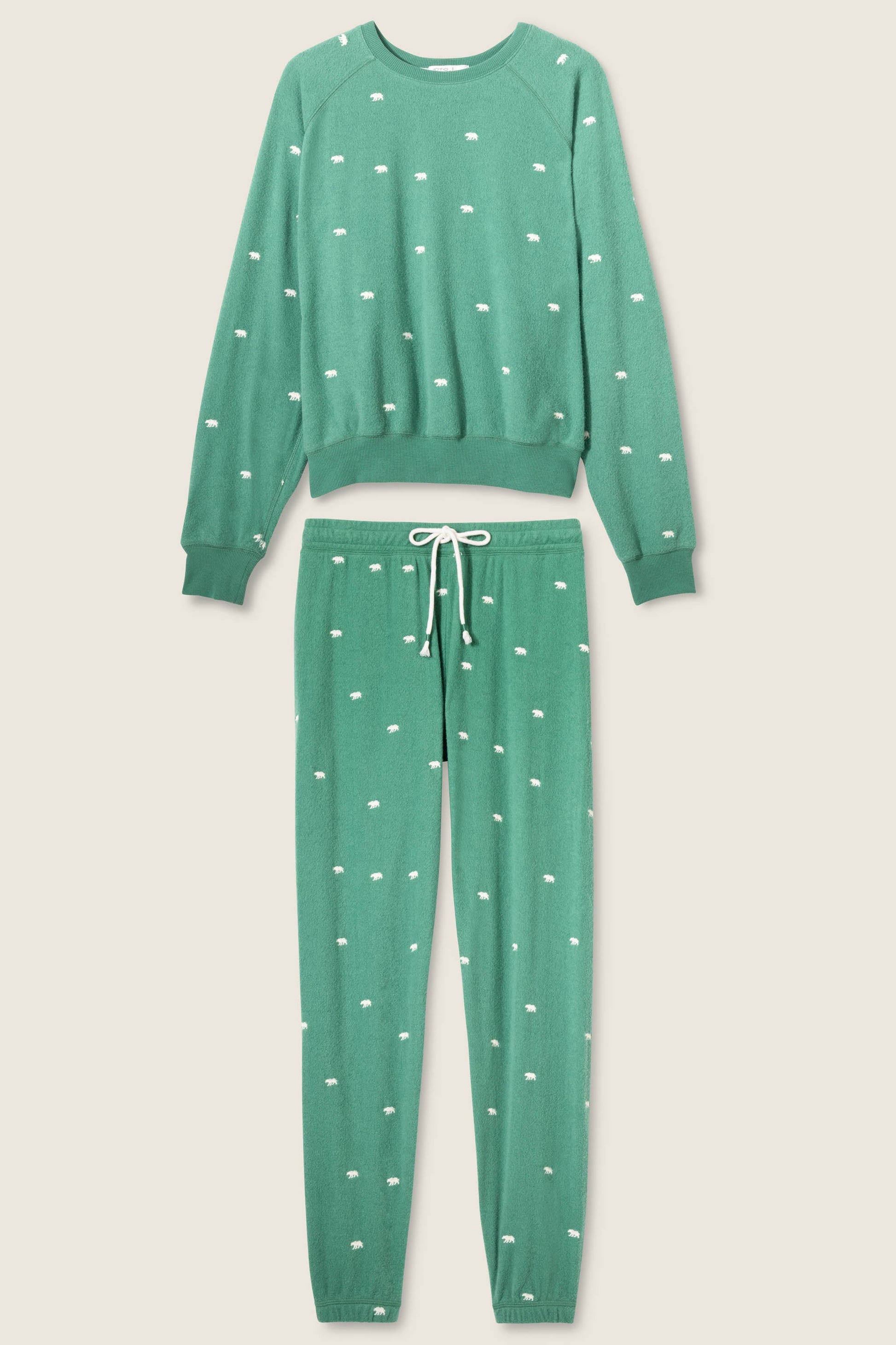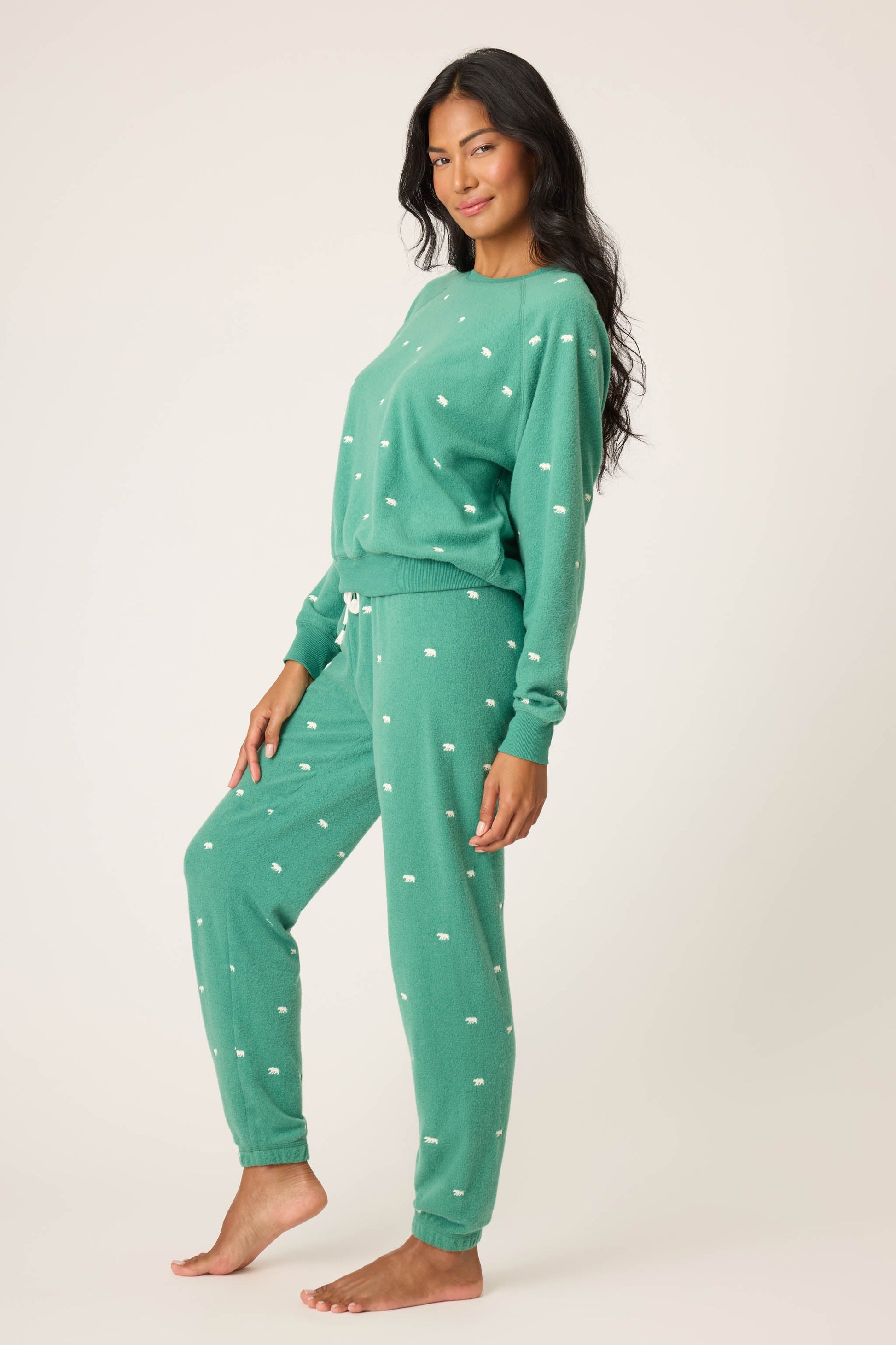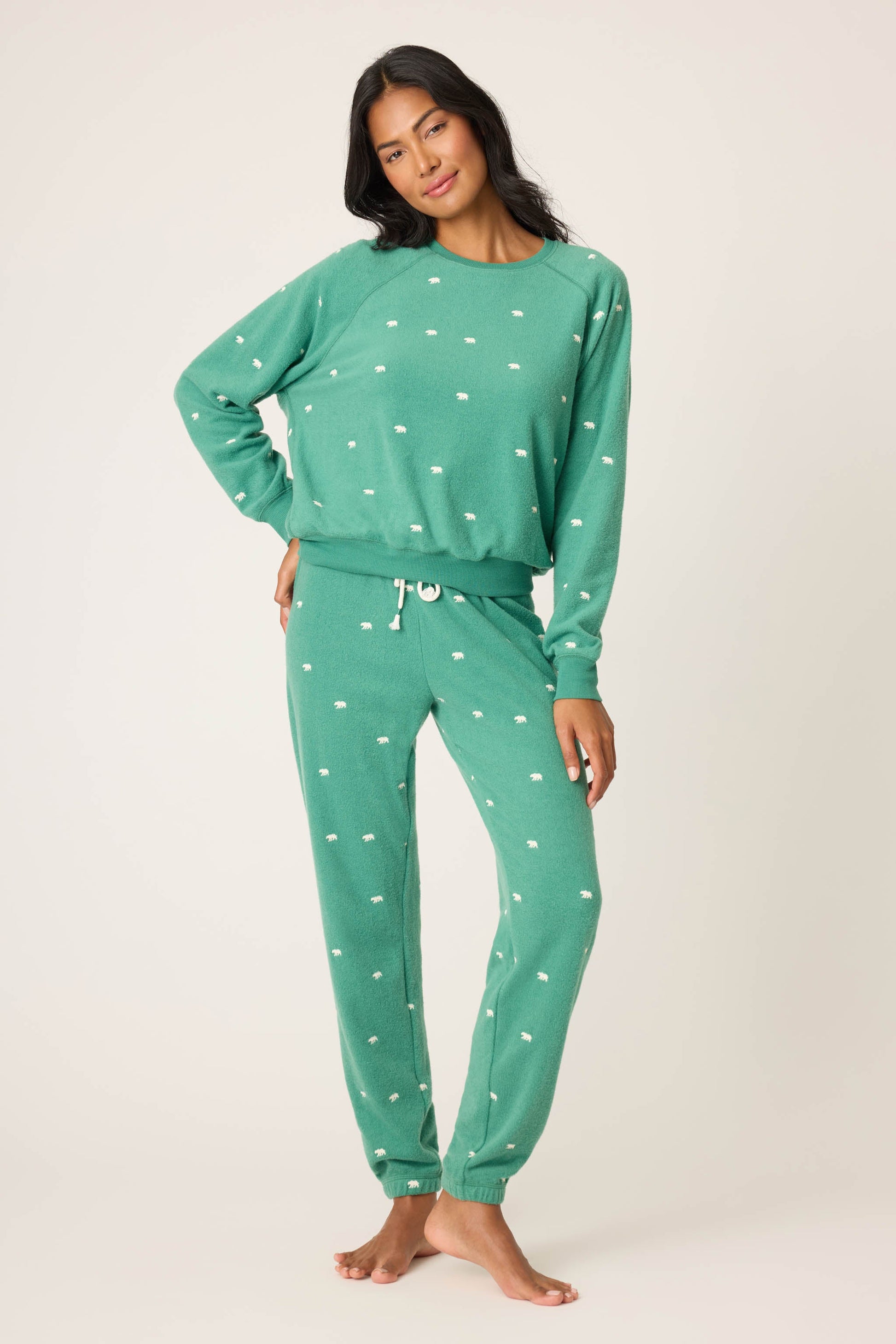 For nights that call for hibernation mode. This two-piece pajama set pairs a cozy crewneck sweatshirt with jogger pants, both scattered with tiny bear motifs. Crafted in soft vintage fleece, they’re made for cozying up all season—whether you’re lounging on the couch or curling up for a nap.