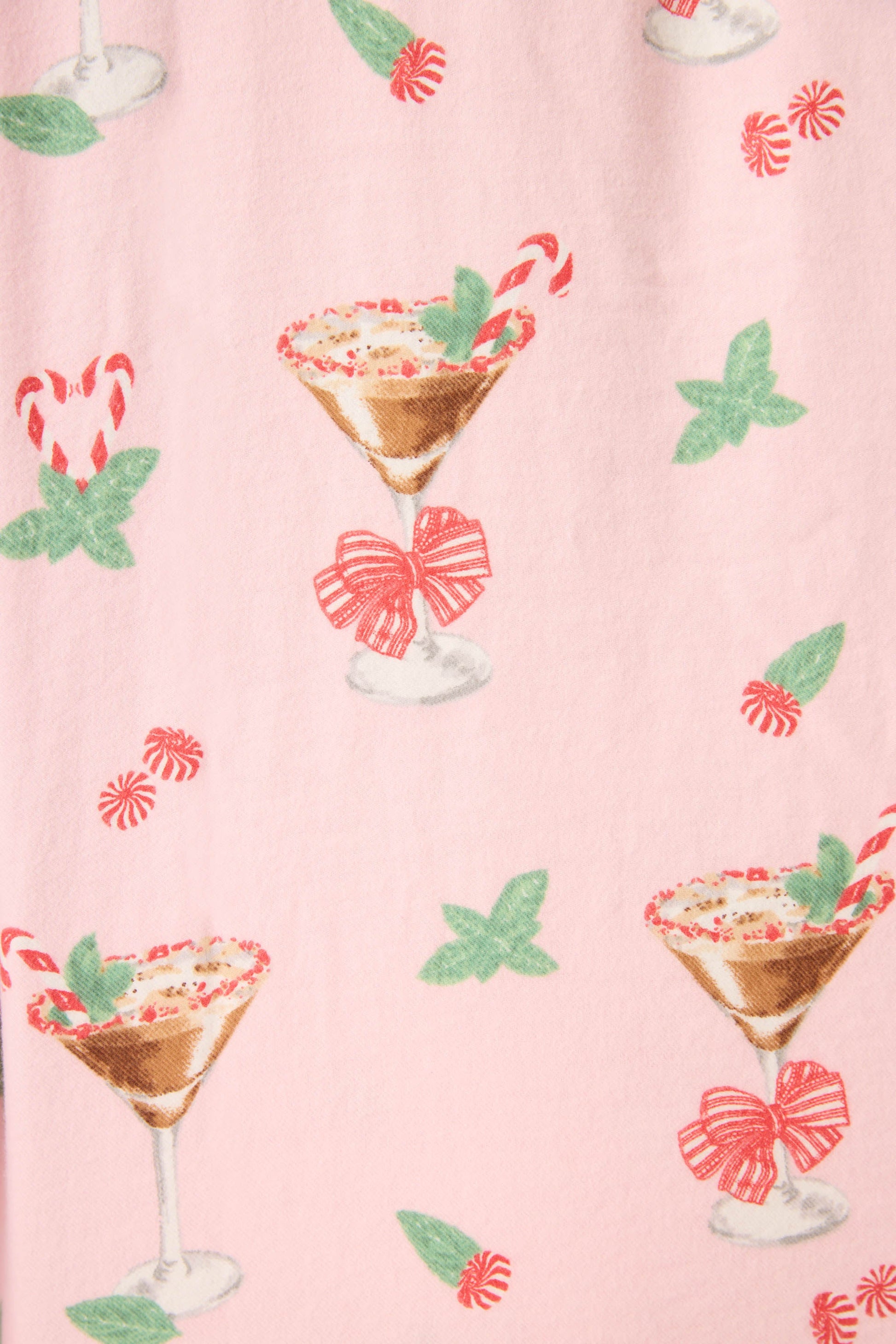 Festive and spirited, this three-piece flannel set is made from soft cotton in a classic twill weave, complete with a button-front top, relaxed drawstring pants, and a matching headband. The blush-pink backdrop is covered in candy cane martinis, mint sprigs, and cheery little bows, finished with contrast piping and a cuff that cheekily reads “Tini Time”—made for holiday happy hours, sweet nightcaps, and drifting off afterwards.